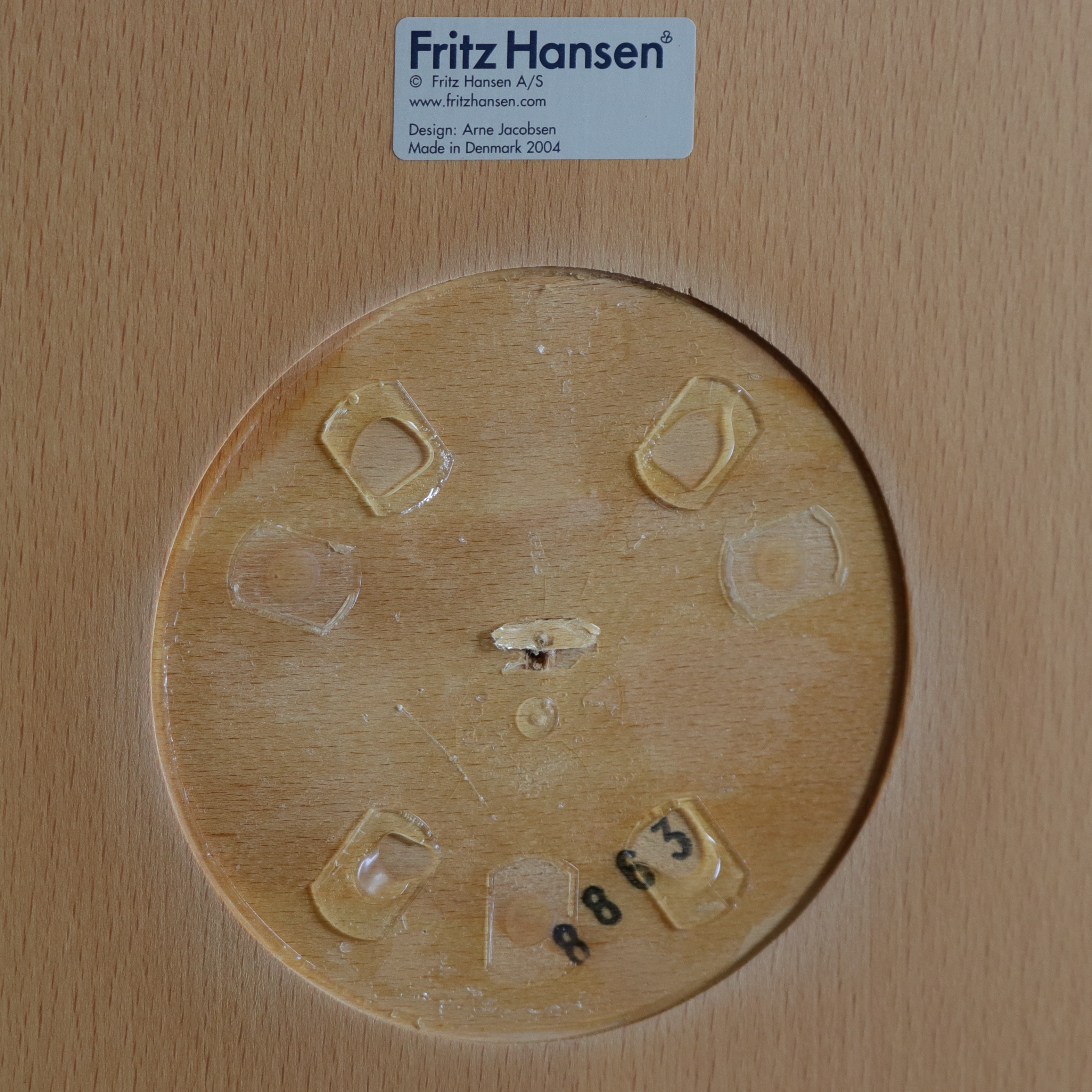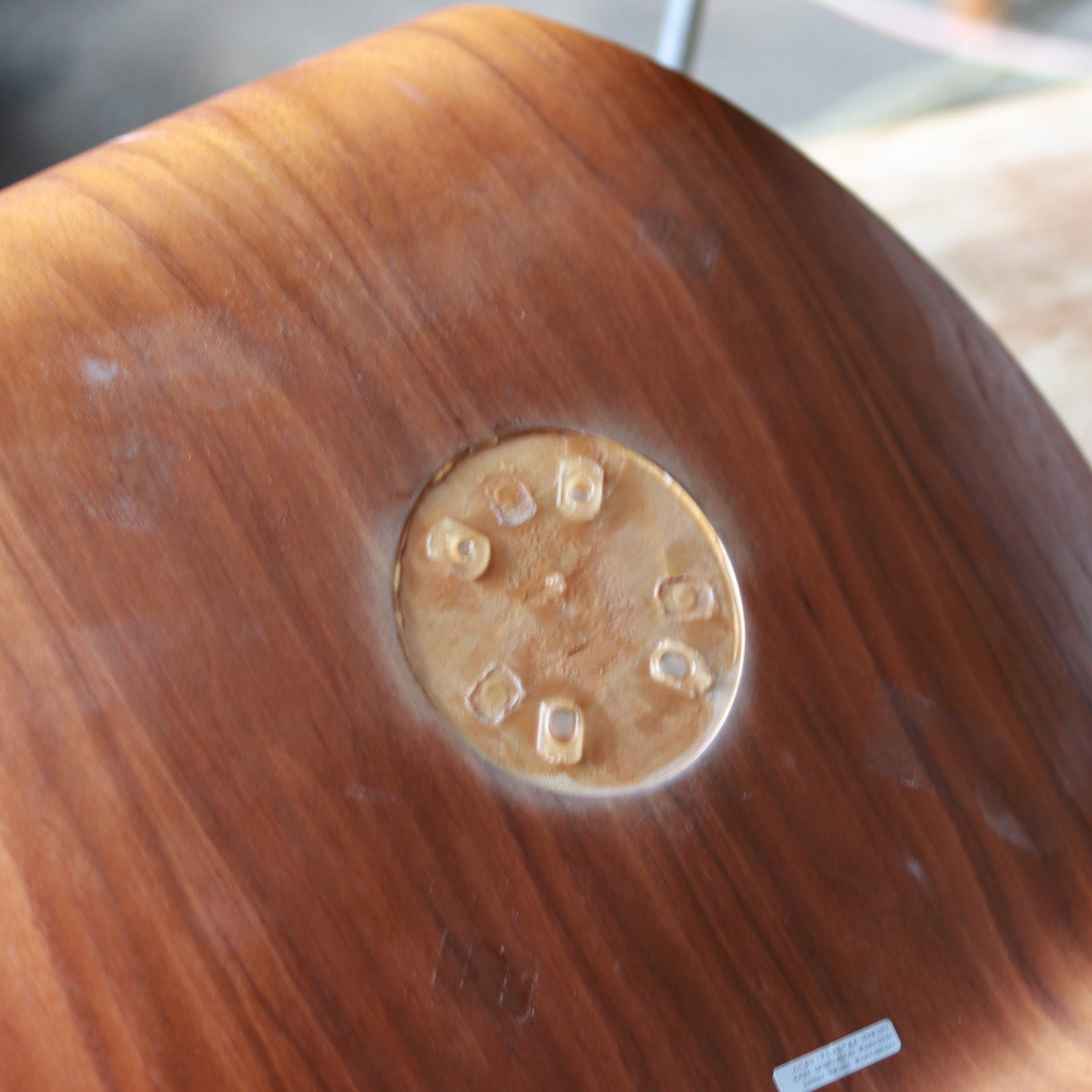 現在、製造されているセブンチェアは、このシェル裏のパーツはプラスチック製となっており、2005年〜2009年頃に製造されたセブンチェアにおいて、このプラスチックパーツが外れてしまった、というご相談を多くいただいています。