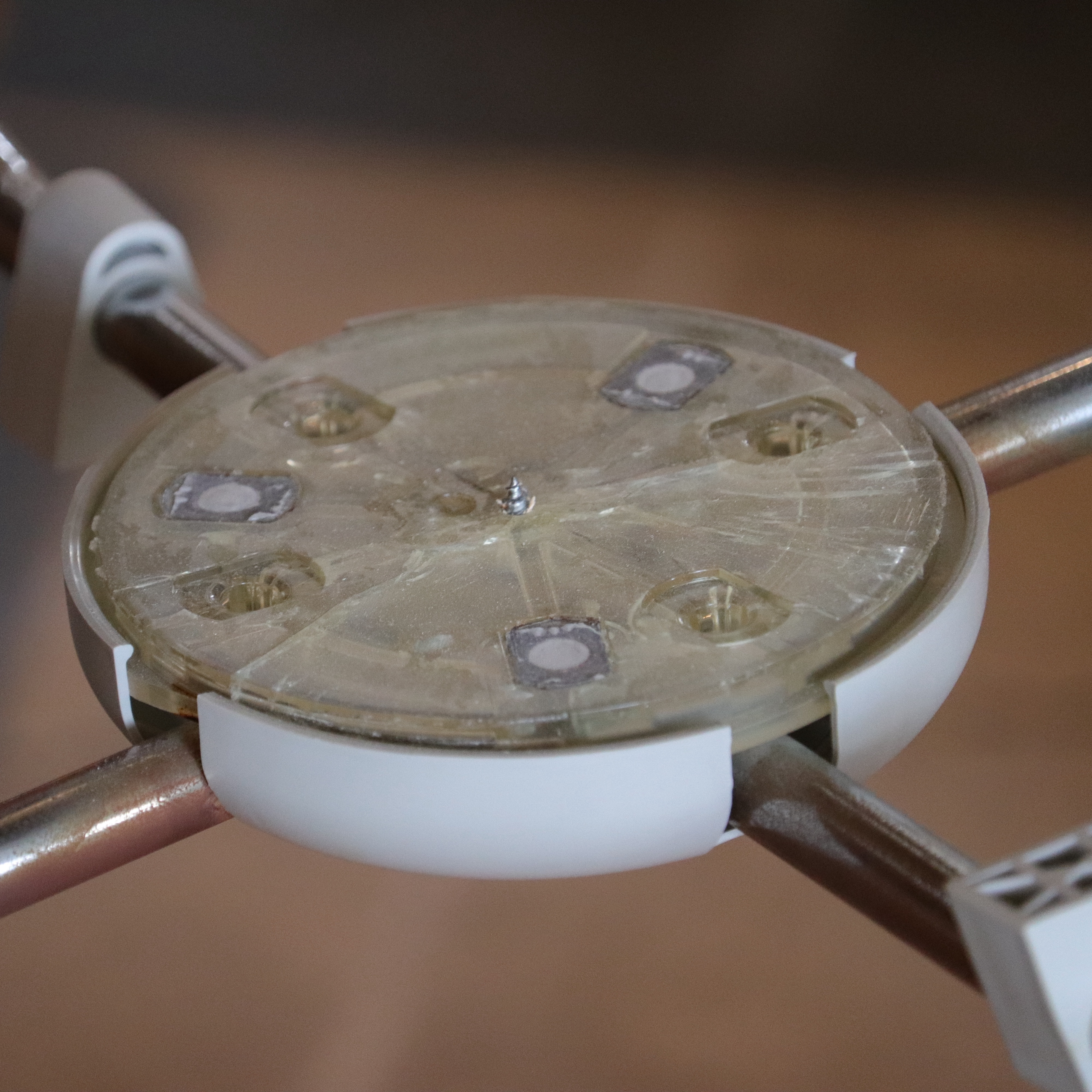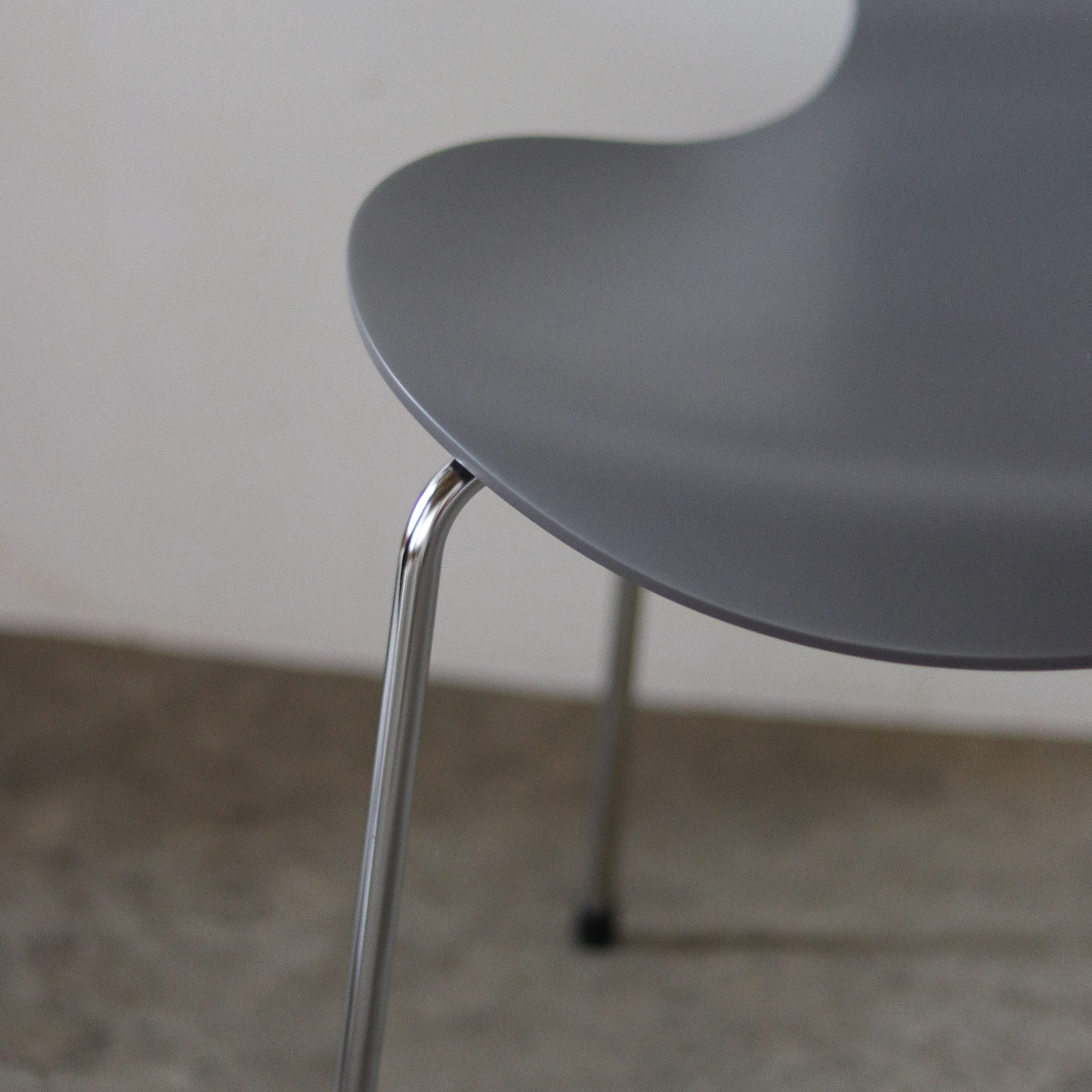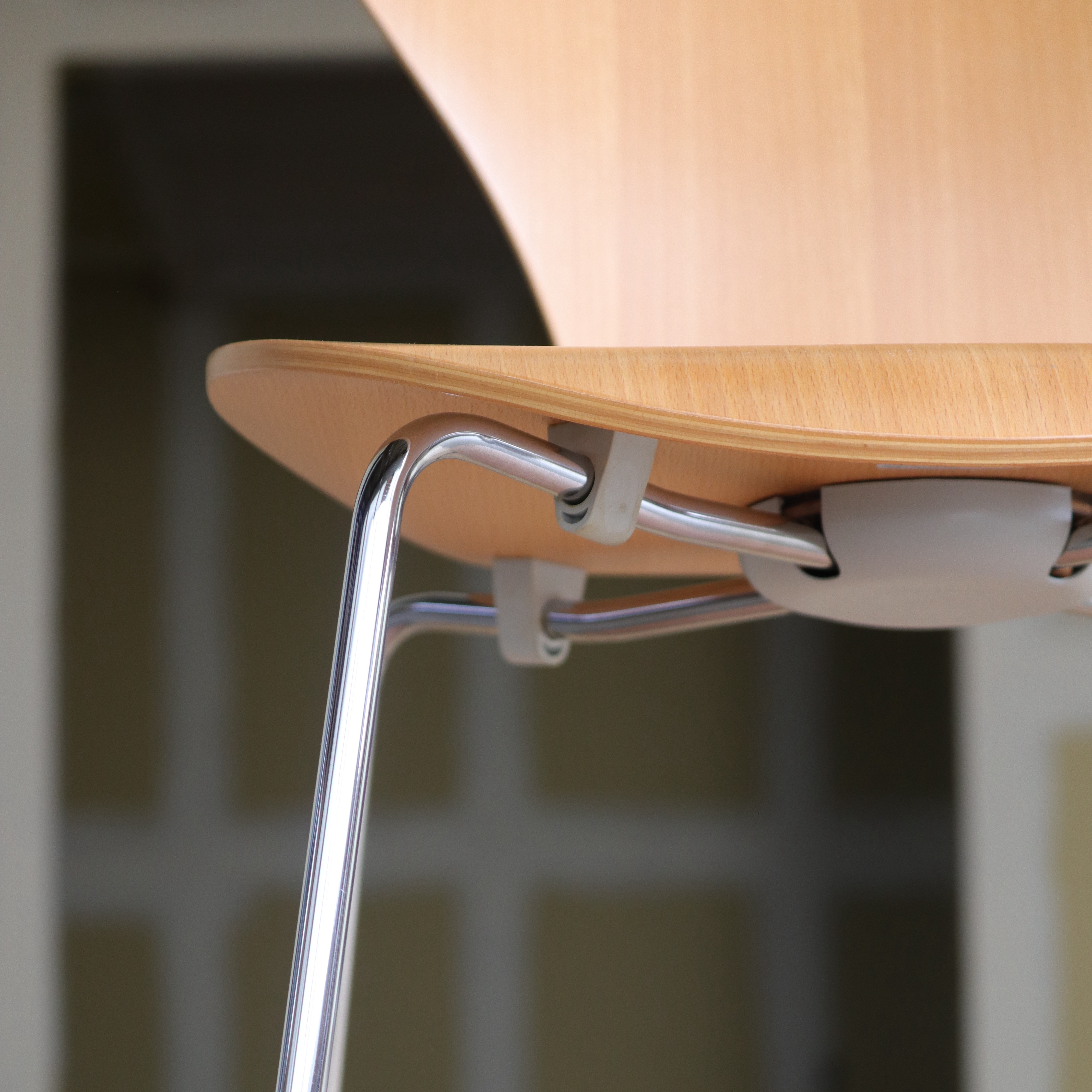 セブンチェアは、シェル(座面)裏側に取り付けられたパーツに、脚部をネジで固定する構造になっています。